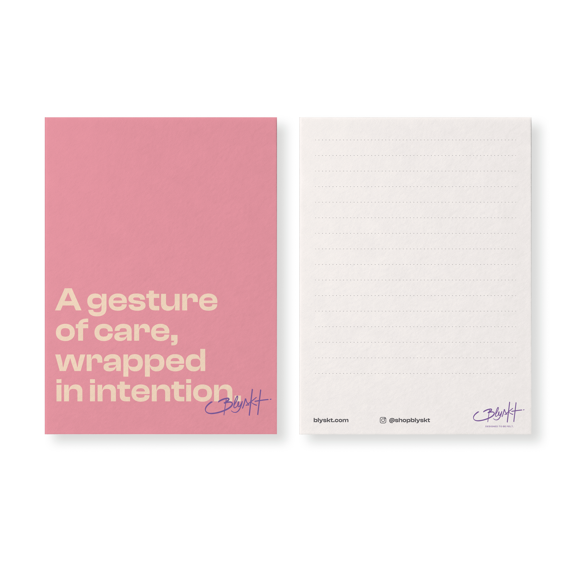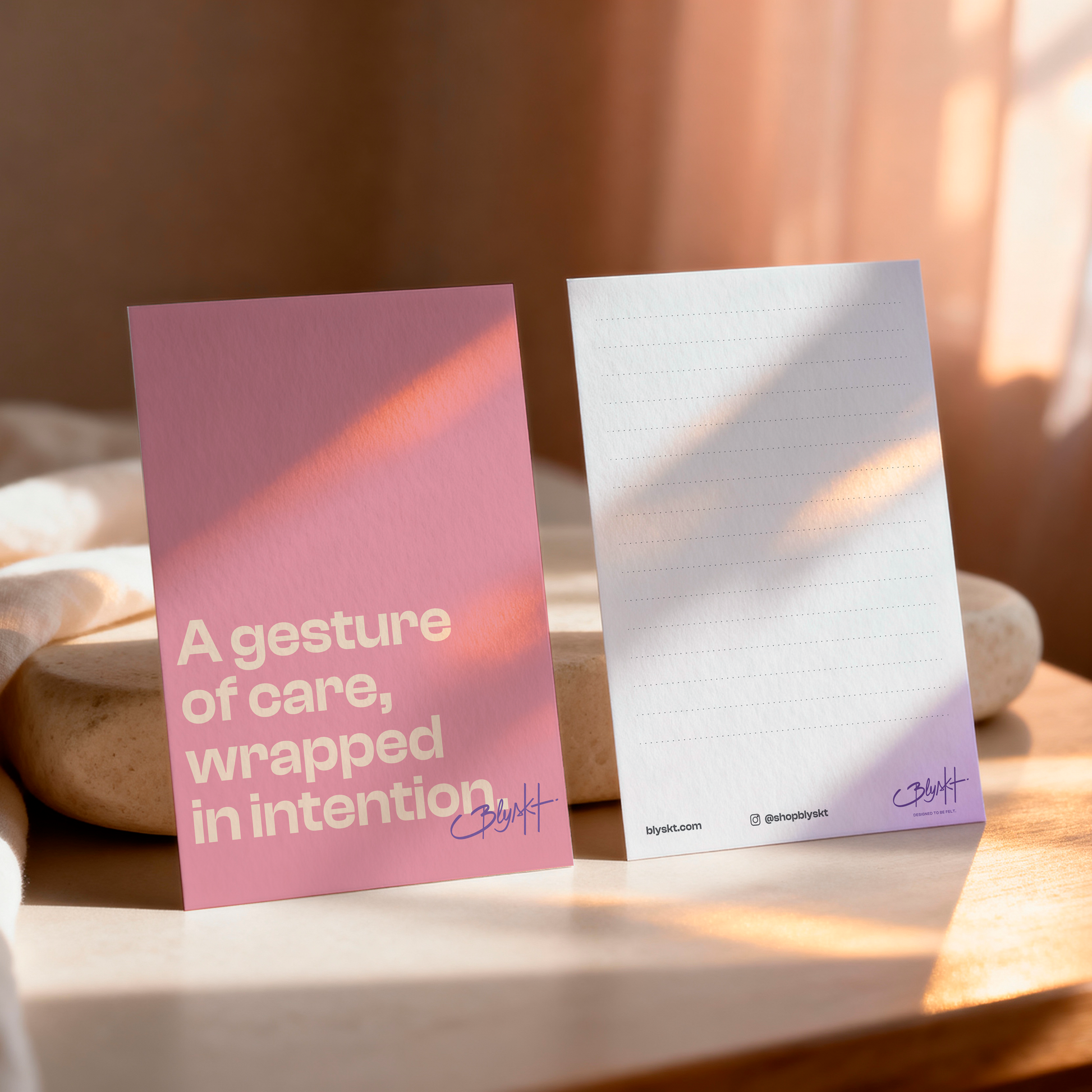 The A Gesture of Care, Wrapped in Intention Card is a 5x7 flat matte greeting card with premium balanced thickness—smooth, sturdy and non-foldable, printed front and back. Thoughtfully designed to elevate Blyskt’s luxury curated boxes, it delivers a warm, mindful message in a clean, minimalist format.