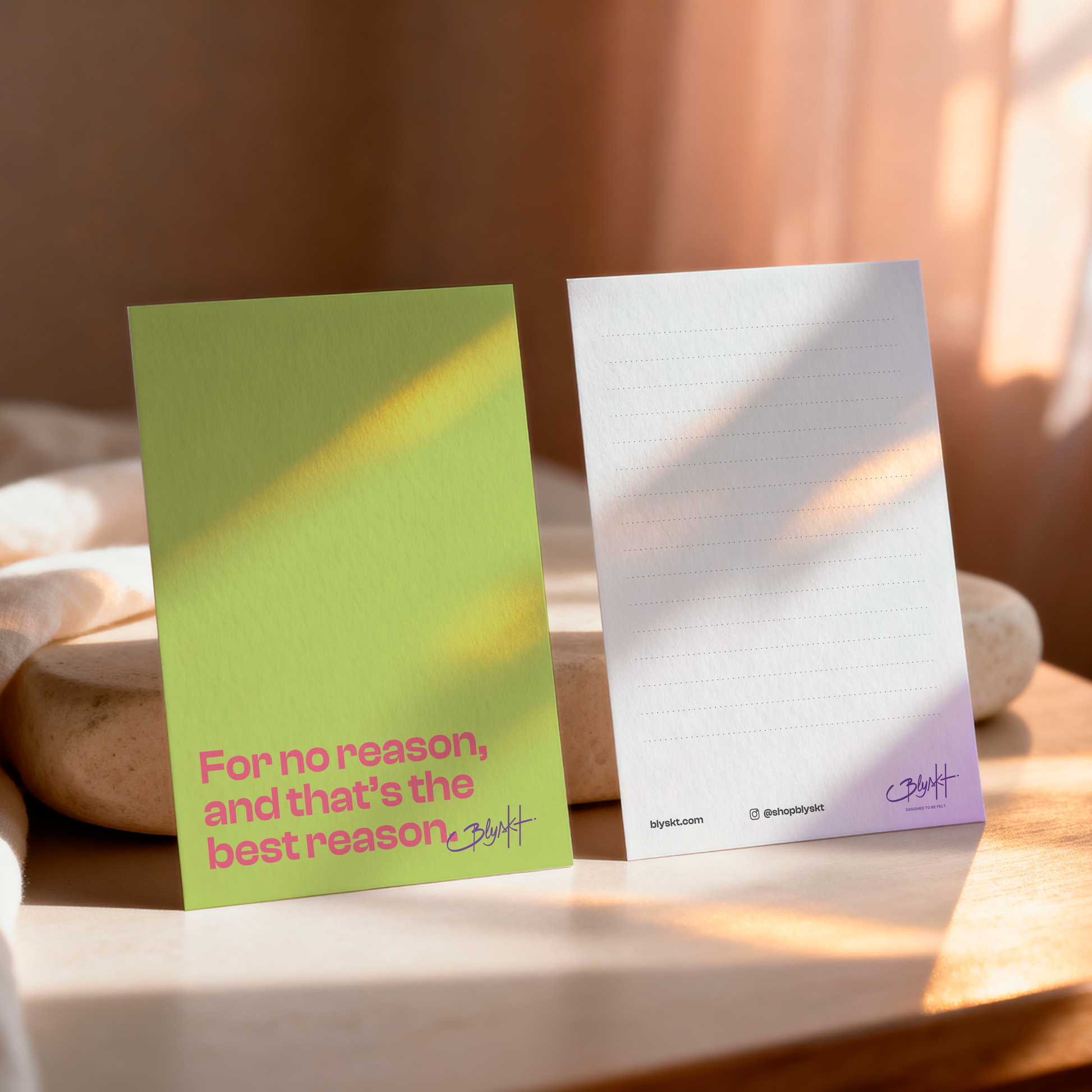 The For No Reason, And That’s the Best Reason Card is a 5x7 flat matte greeting card with premium, balanced thickness—smooth, sturdy and non-foldable, printed front and back. Its minimalist design makes it a refined choice for curated Blyskt boxes and spontaneous, heartfelt gifting.