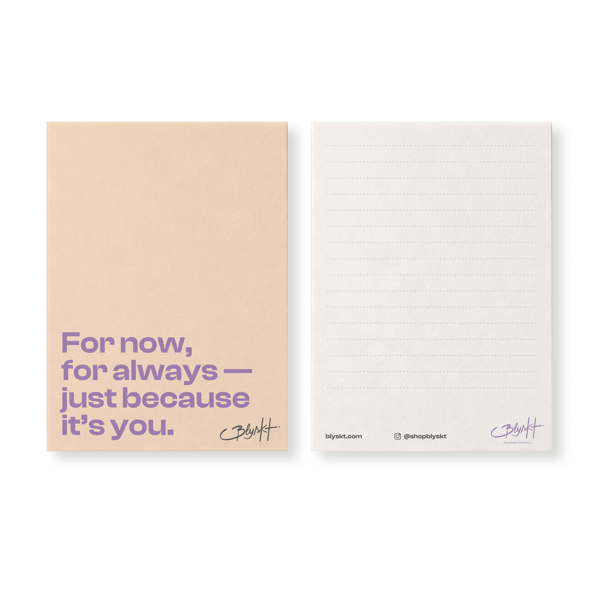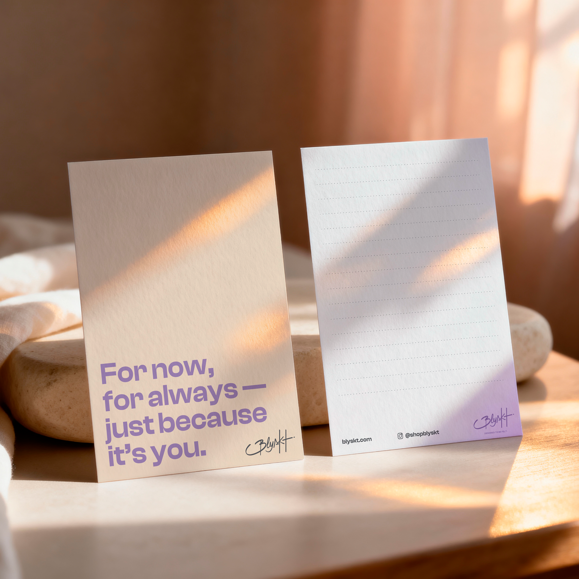 The For Now, For Always, Just Because It’s You Card is a 5x7 flat matte greeting card with premium balanced thickness—smooth, sturdy and non-foldable, printed front and back. A refined, emotional design crafted to elevate curated Blyskt gift boxes and intimate moments.