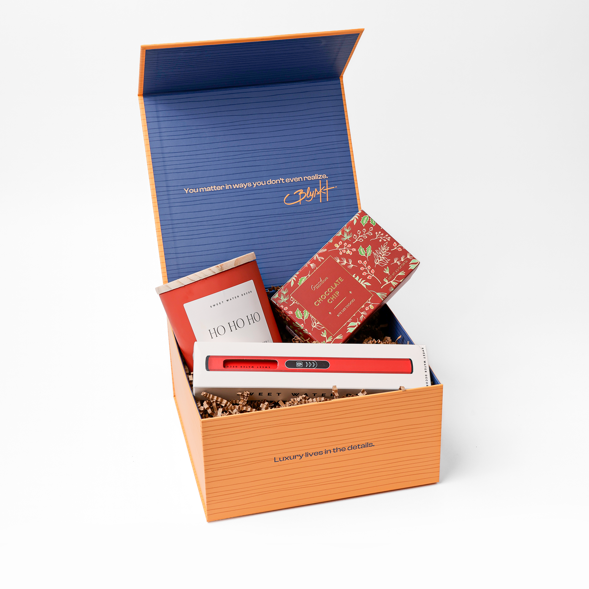 This Blyskt gift box pairs a playful seasonal candle with indulgent chocolate chip cookies and a sleek rechargeable candle lighter—creating a modern holiday moment that feels warm, fun, and intentionally curated. It’s cheerful without being overdone, designed to spark cozy nights, laughter, and small seasonal rituals.
