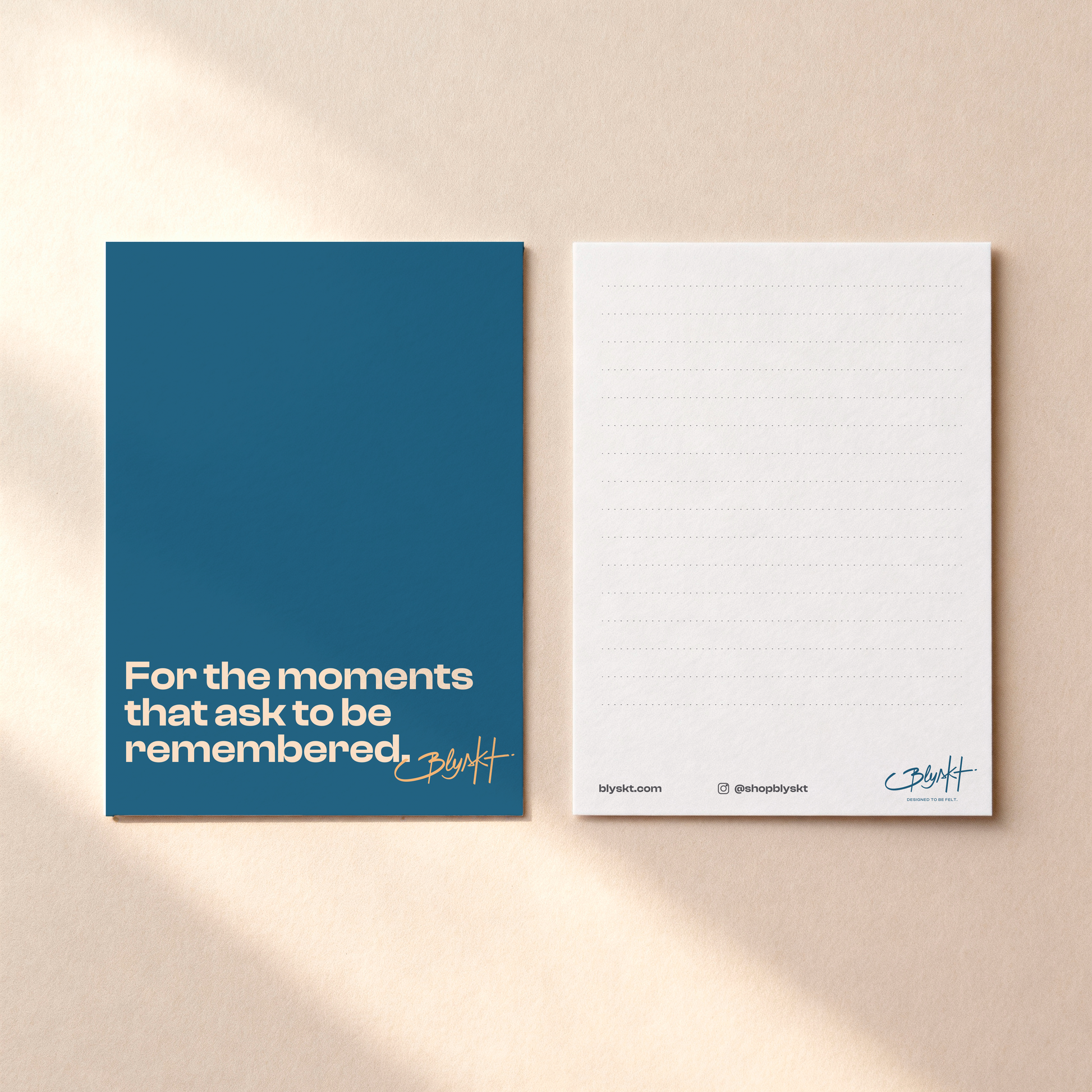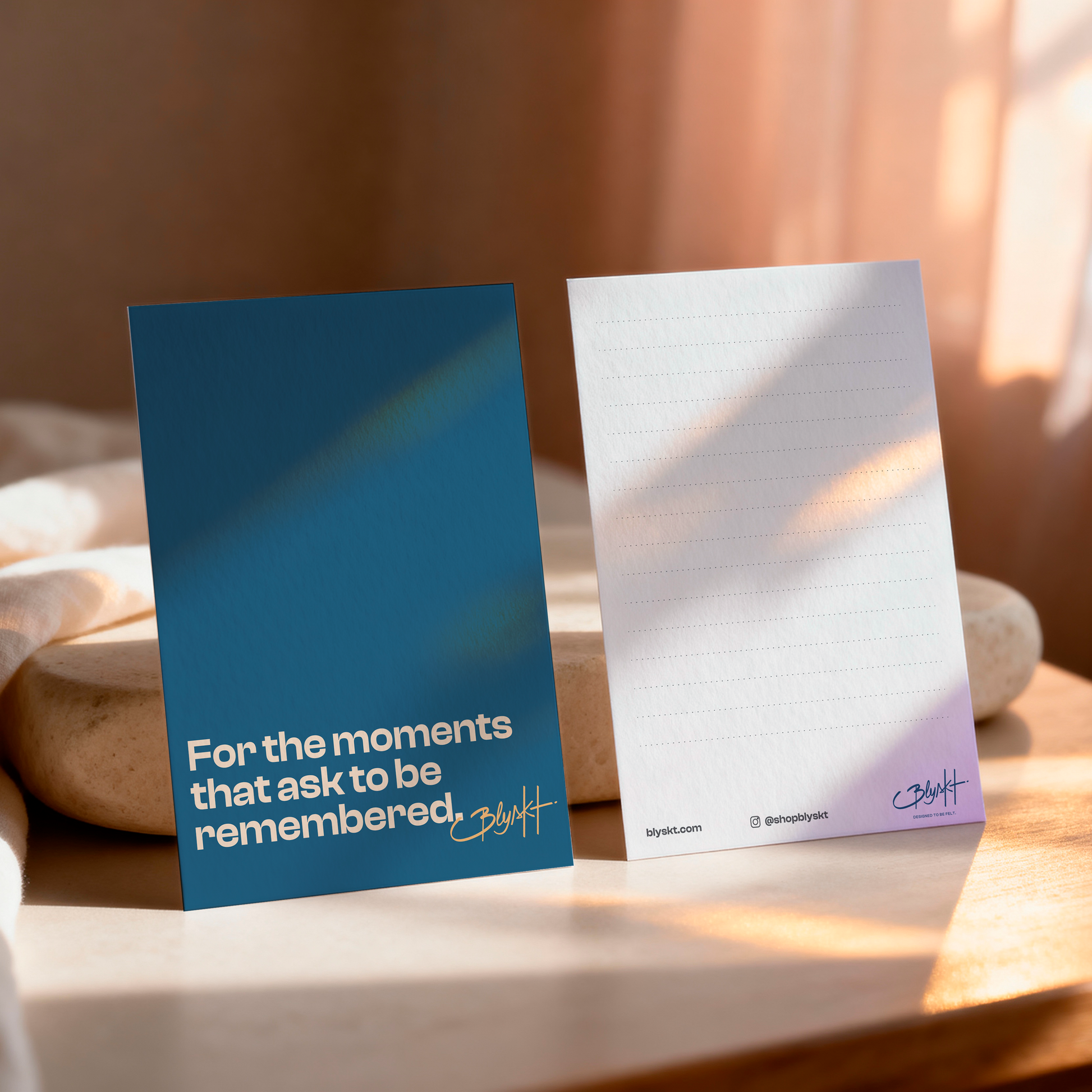 The For the Moments That Ask to Be Remembered Card is a 5x7 flat matte greeting card with premium balanced thickness—smooth, sturdy and non-foldable, printed front and back. Designed to elevate Blyskt’s curated boxes, it brings a poetic, timeless touch to meaningful gifting.