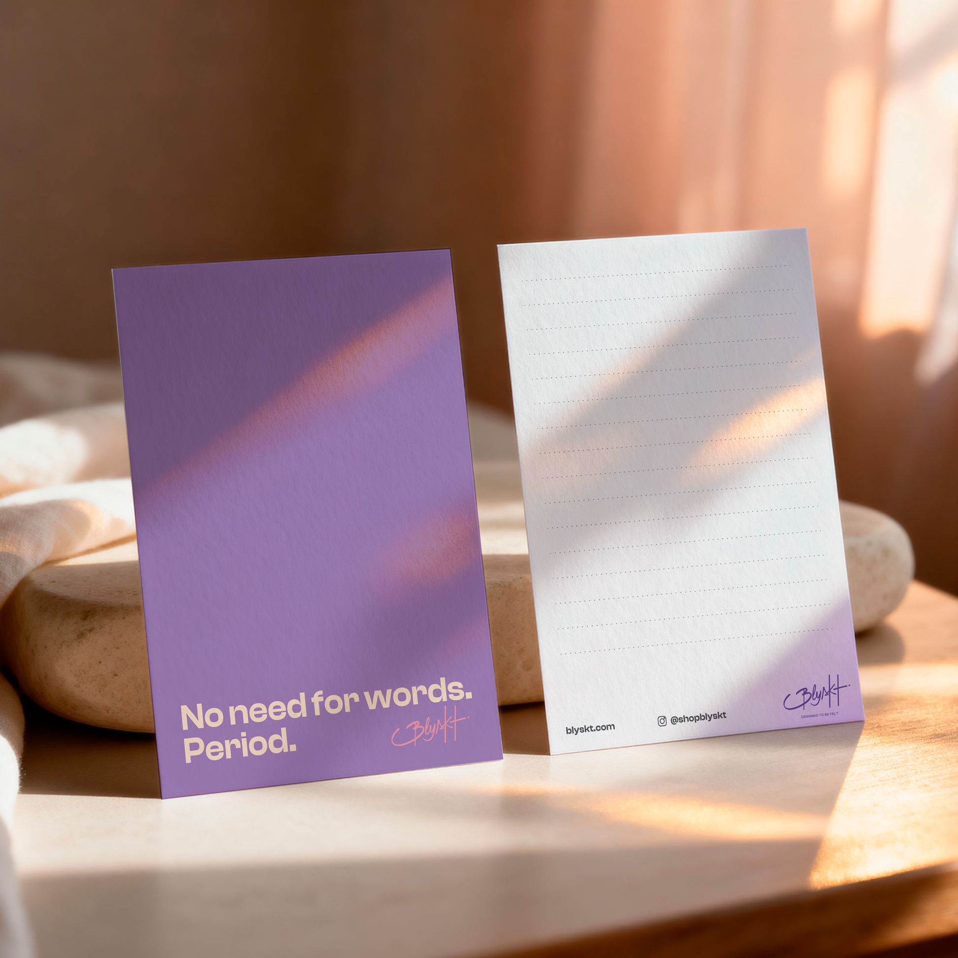 The No Need For Words. Period. Card is a 5x7 flat matte greeting card with balanced premium thickness—smooth, sturdy and non-foldable, printed on both sides. Designed to elevate curated Blyskt gift boxes, it delivers a bold, modern message with intentional simplicity.