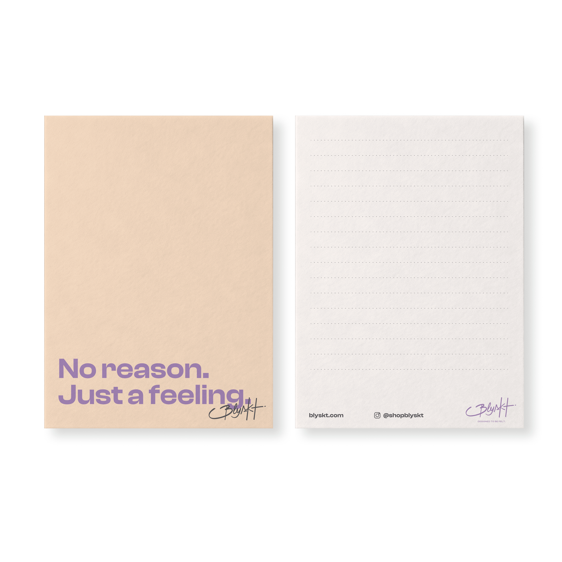 The No Reason, Just a Feeling Card is a 5x7 flat matte greeting card with premium, balanced thickness—smooth, sturdy and non-foldable, printed front and back. Designed to elevate curated Blyskt boxes, it delivers a soft, modern message that feels personal and intentional.