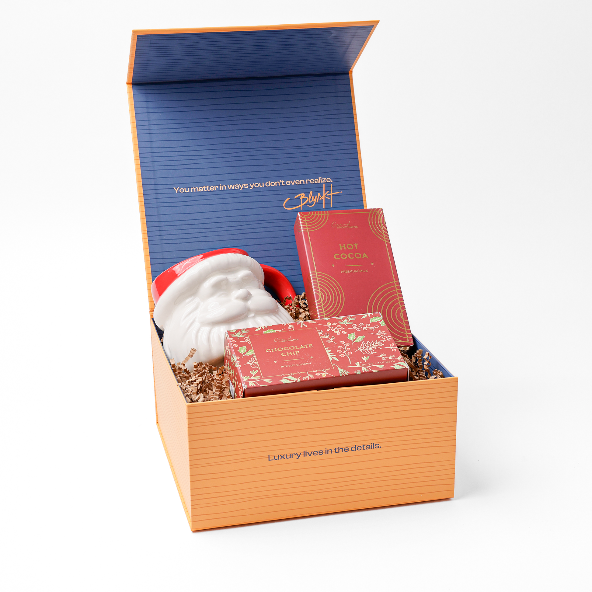 A comfort-forward gift box designed to feel festive, cozy, and unapologetically cheerful. This Blyskt gift box brings together classic holiday warmth—pairing a playful Santa-shaped ceramic mug with rich hot cocoa and indulgent chocolate chip cookies. It’s nostalgic without feeling childish, curated to create simple winter moments that feel joyful, familiar, and easy to enjoy.