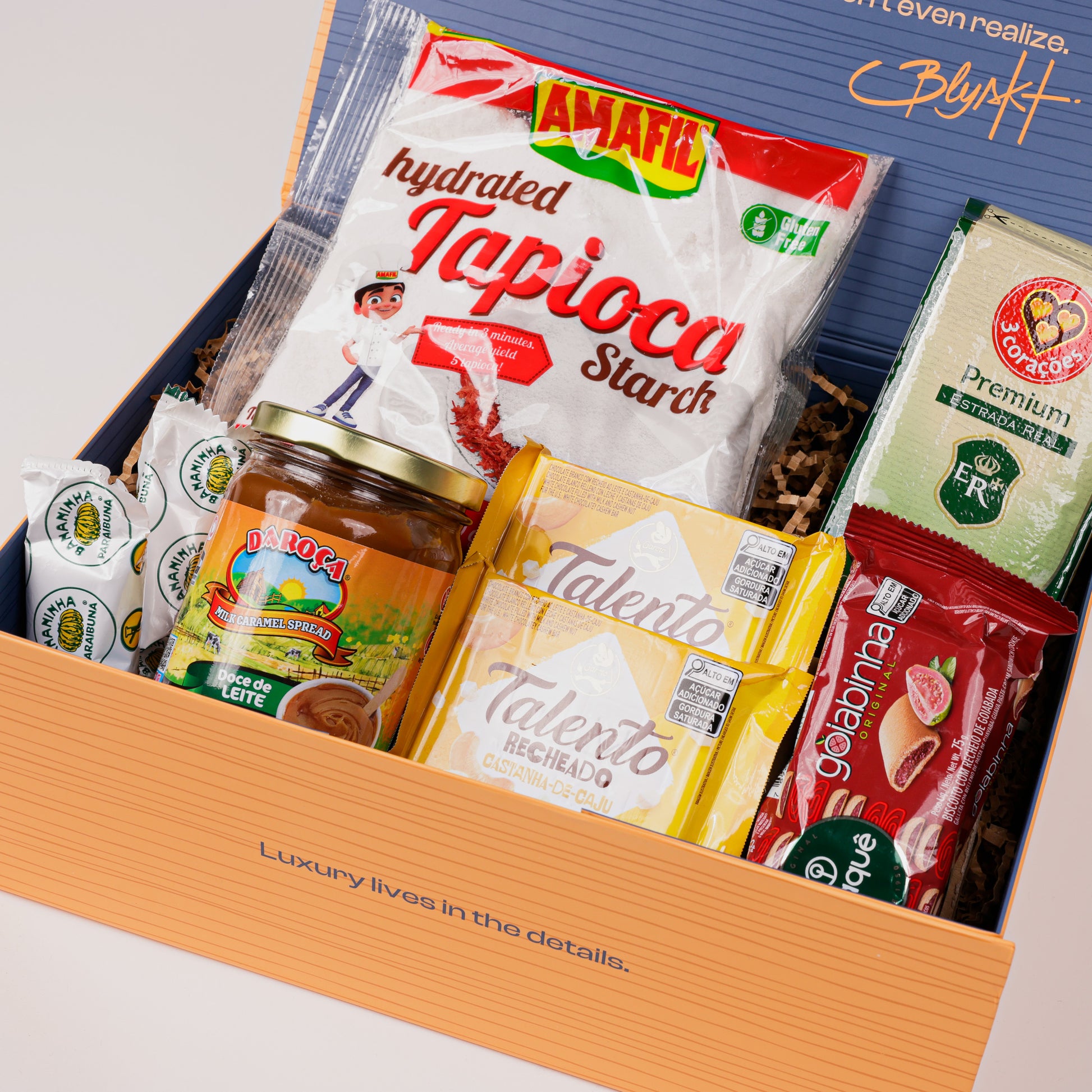 Includes hydrated tapioca starch (Amafil), Brazilian ground coffee, Talento chocolate bars, guava-filled snack cakes (Goiabinha), doce de leite spread (DaRoΓ§a), brigadeiro candies, and Blyskt rigid signature box.